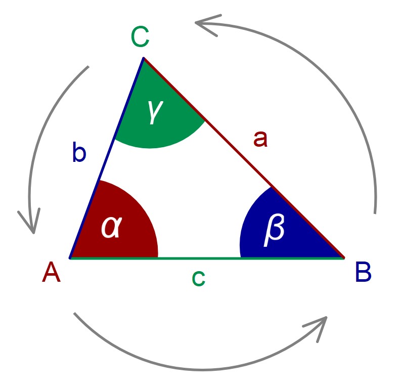 Ein Dreieck besteht aus drei Seiten. Es wird gegen den Uhrzeigersinn beschriftet. Die Seiten tragen Kleinbuchstaben, die Punkte Großbuchstaben, die Winkel griechische Buchstaben.
